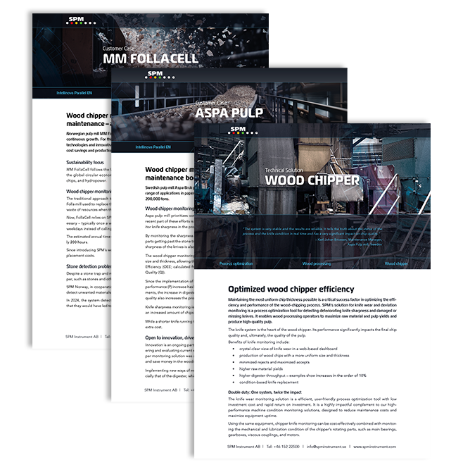 Our knife wear monitoring solution provides valuable insights into the condition of wood chipper knives. Through the Condmaster.NET dashboard, users can analyze performance data to manage knife replacement proactively. Graphs clearly indicate if a knife is damaged, dull, detached, or missing from the holder. The result? More consistent chip size and thickness, reduced reject rates, improved raw material yield, and increased throughput.